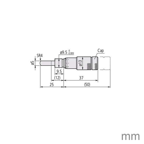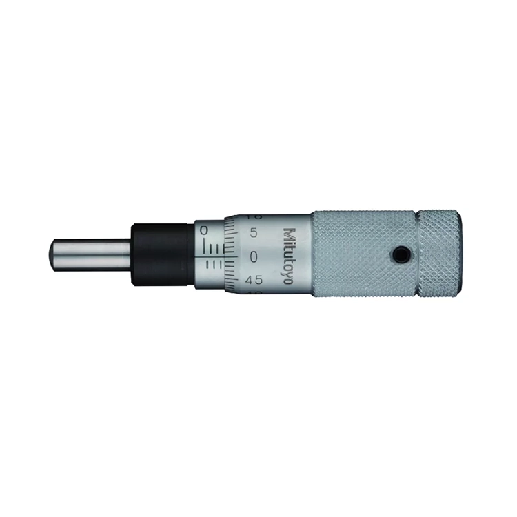 A small, standard, zero-adjustable non-digital Mitutoyo micrometer head with plain 9.5mm stem and spherically radiused spindle tip.